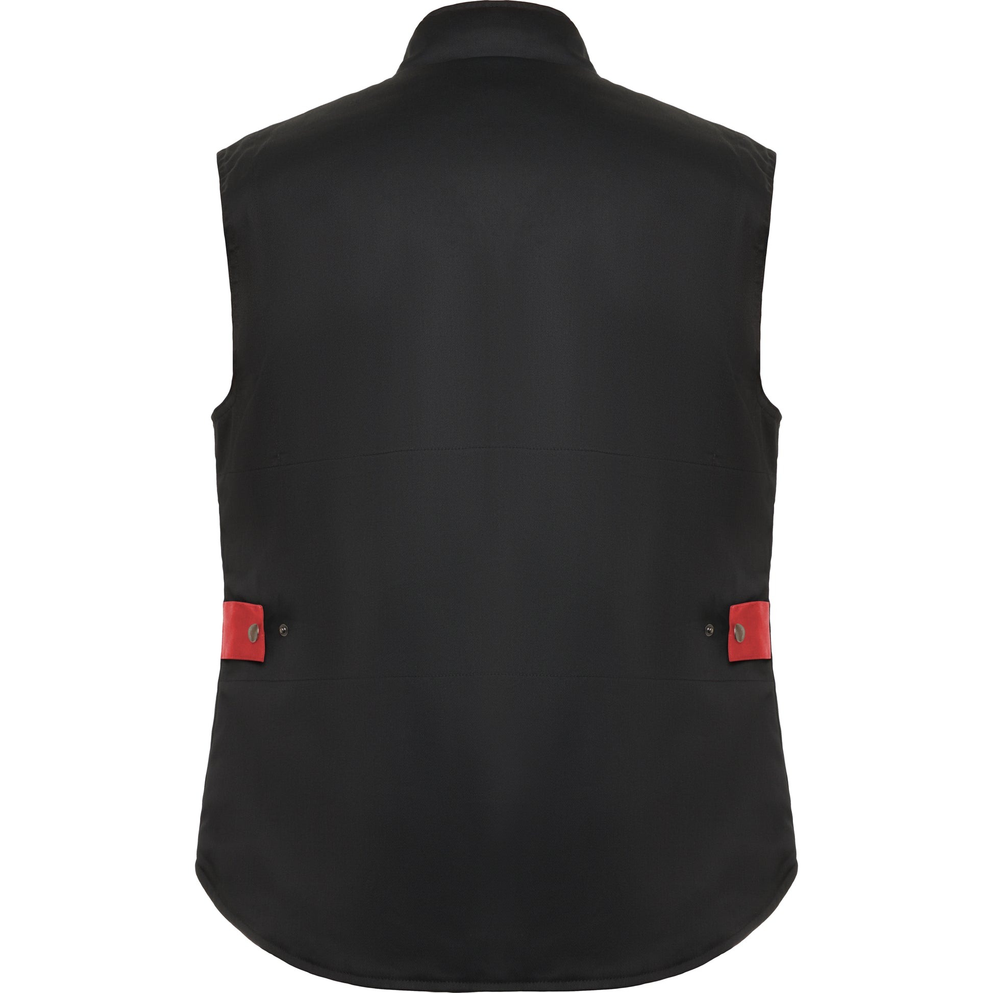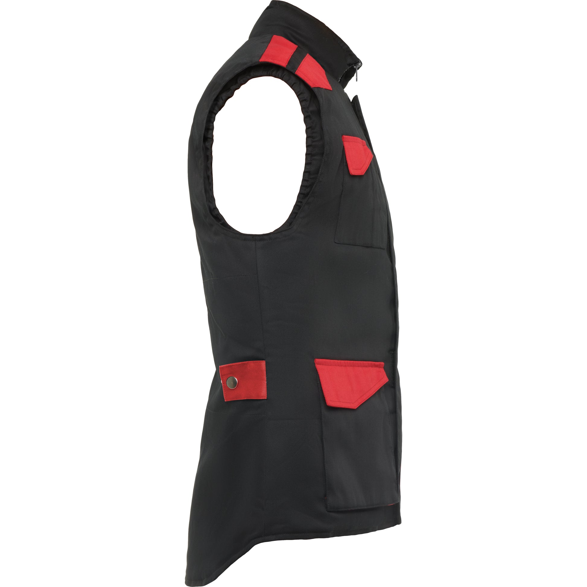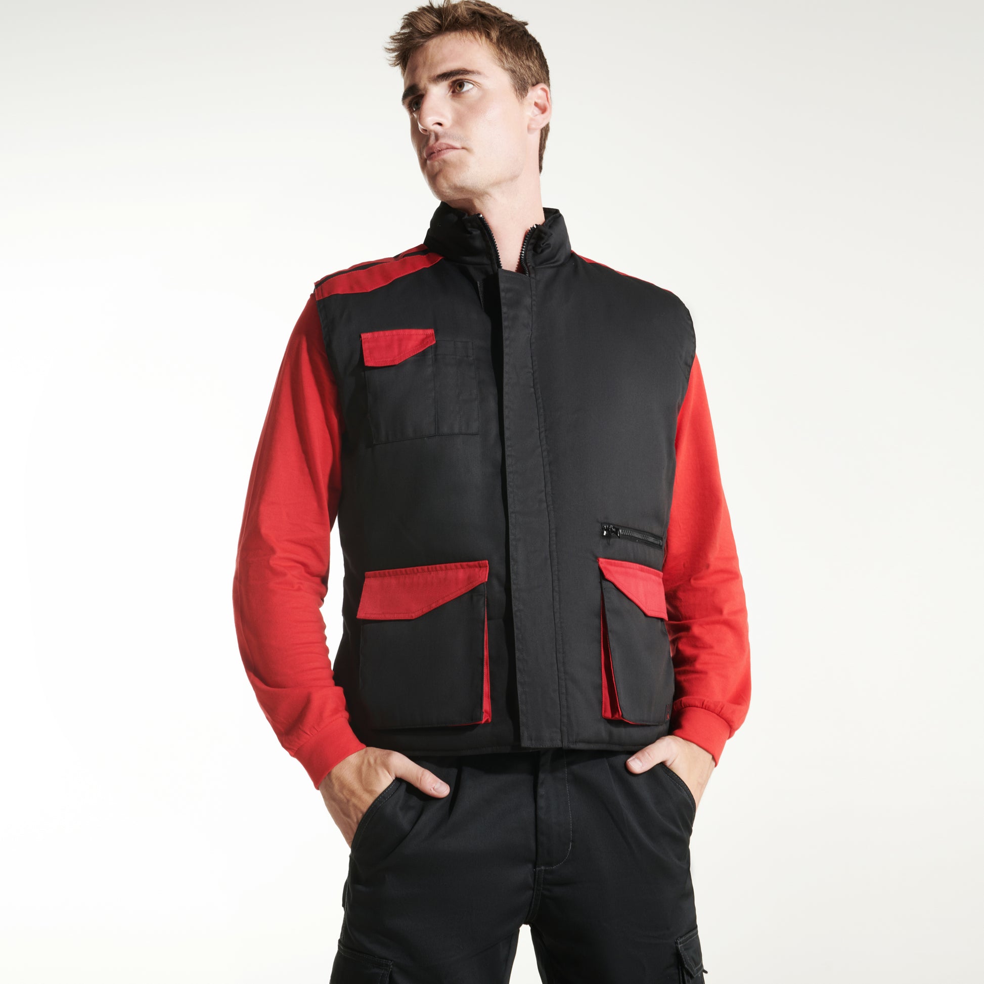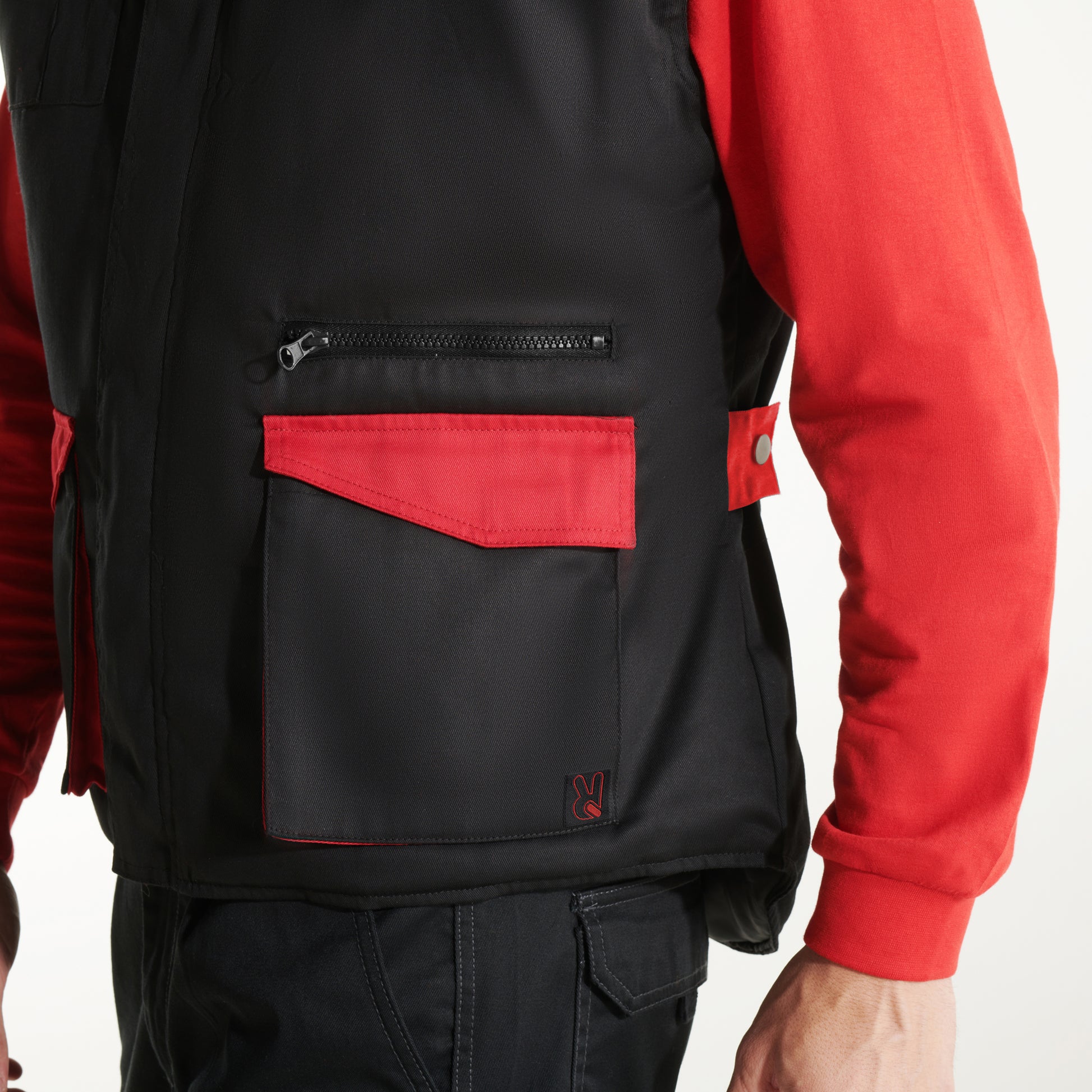 Chaleco laboral multibolsillos con cuello alto en colores combinados.
