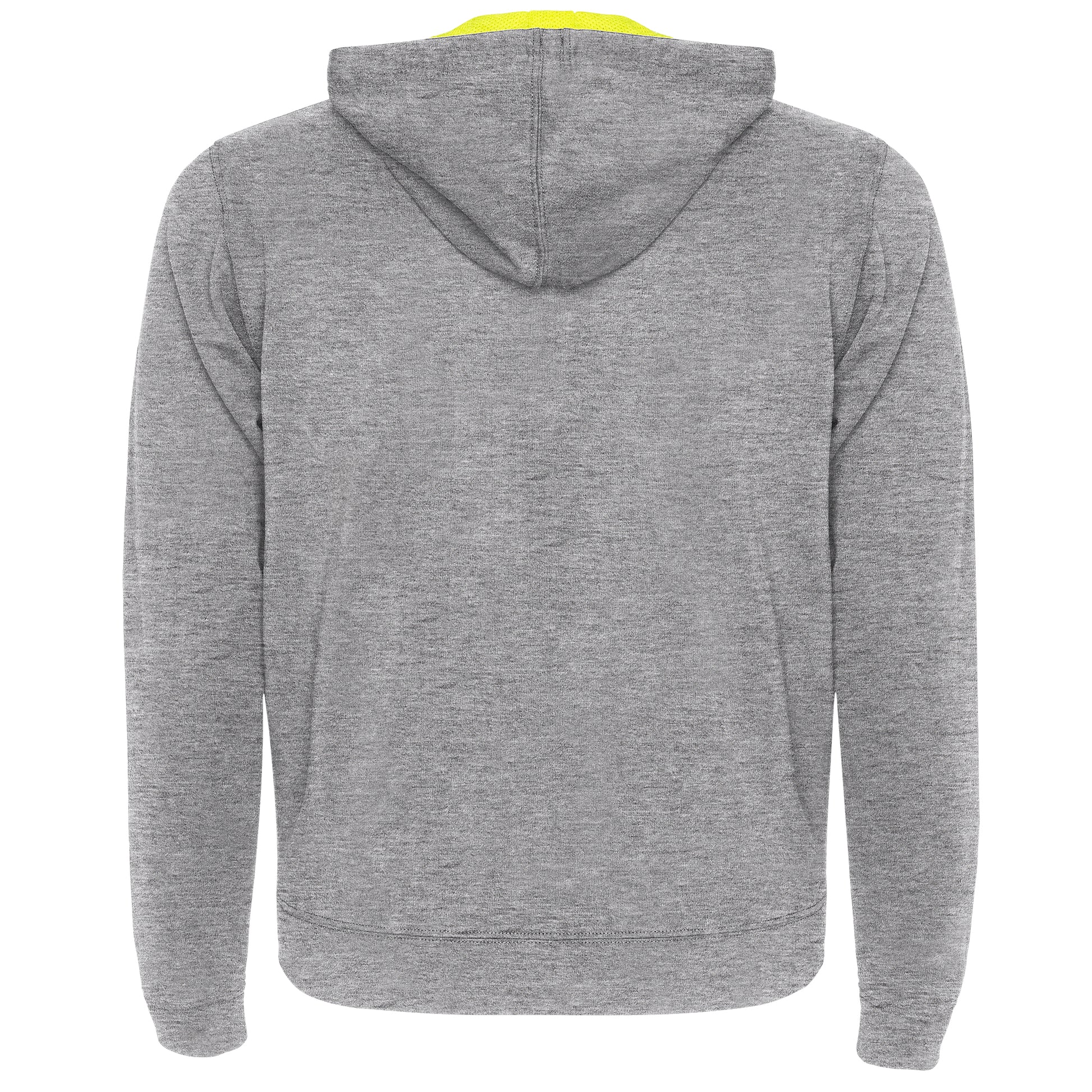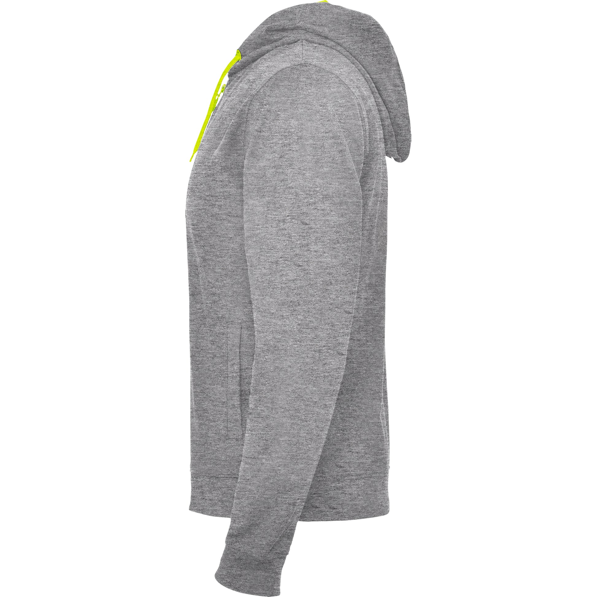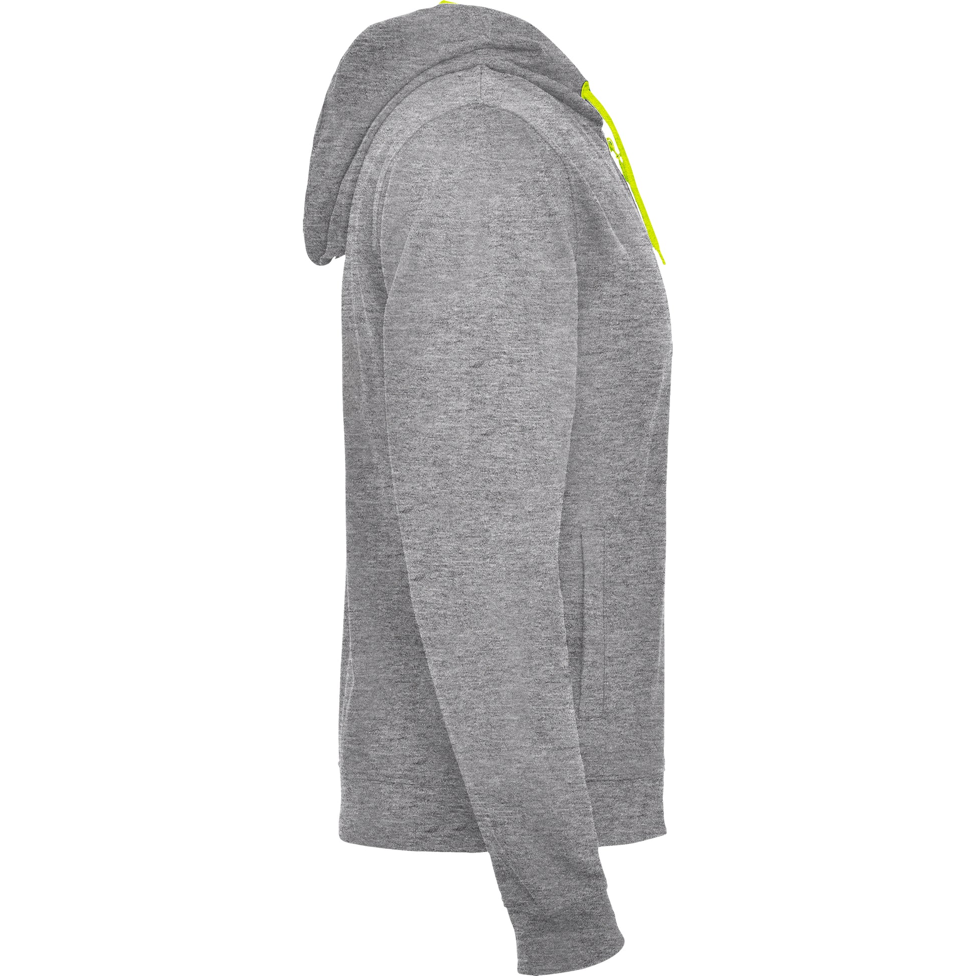 Chaqueta de felpa no perchada con detalles en color flúor. Cremallera central con tirador en contraste color flúor. Capucha con forro interior en tejido de poliéster microperforado en contraste color flúor, con cordón y ojales metálicos en contraste color flúor. Manga larga con puño y cintura en punto canalé 1x1. Dos bolsillos frontales con vivo ancho. Cubrecosturas reforzado en el cuello interior.
