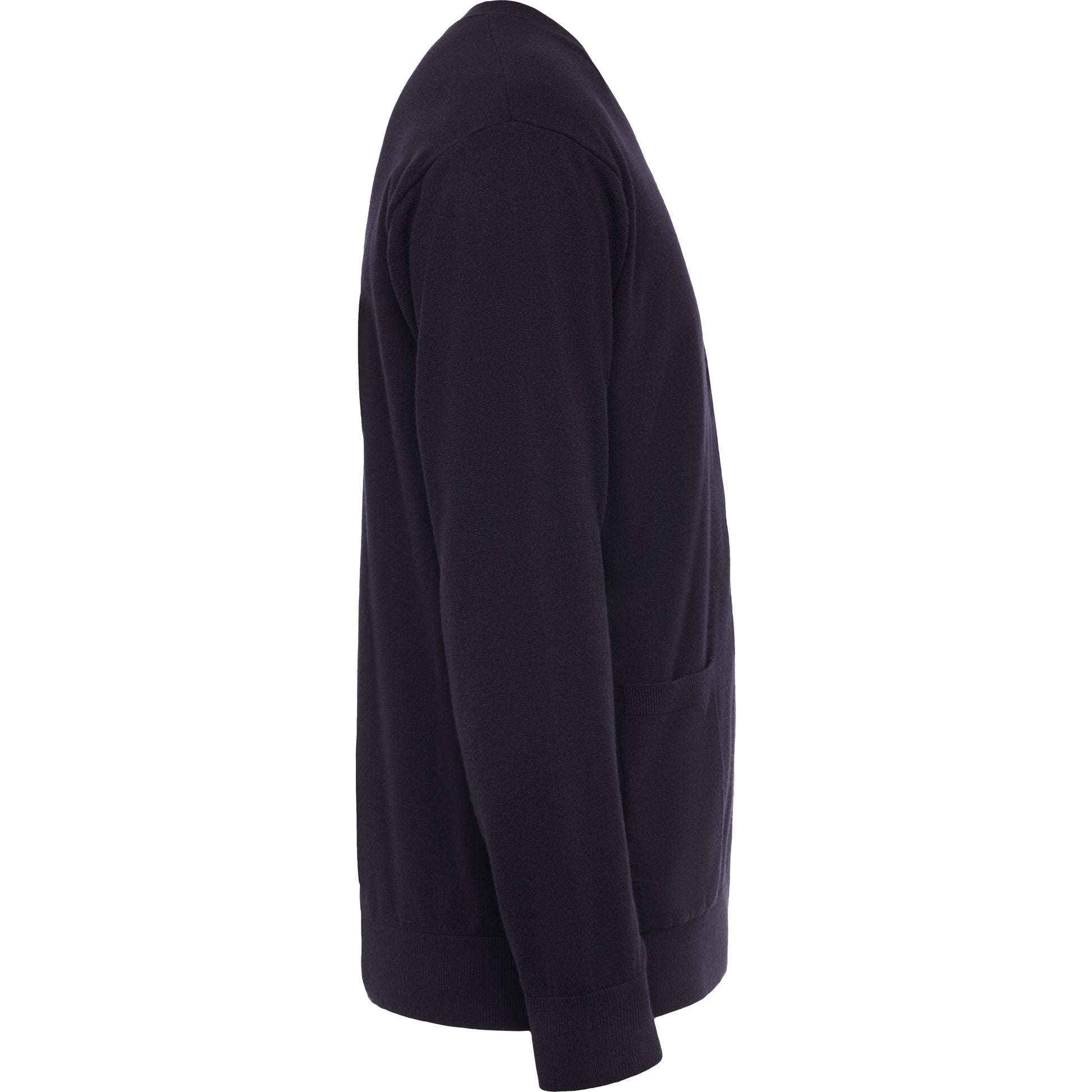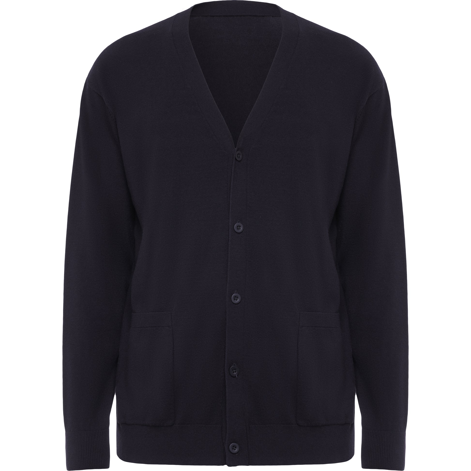 Chaqueta con escote de pico. Tejido en punto suave. Cierre central de cinco botones al tono. Dos bolsillos de plastón. Puños y cintura elásticos en punto canalé.
