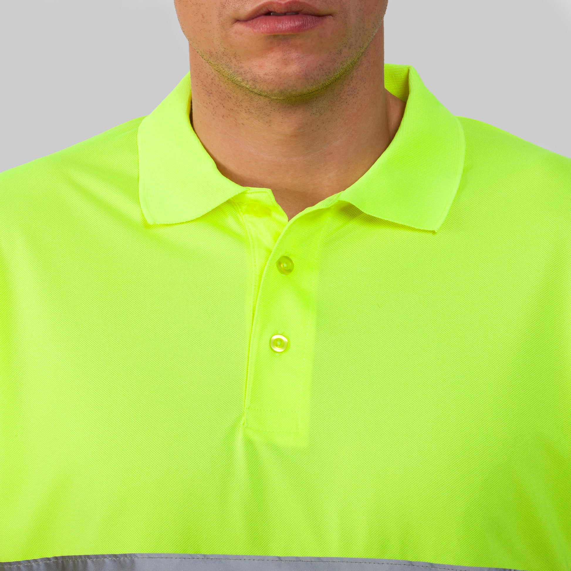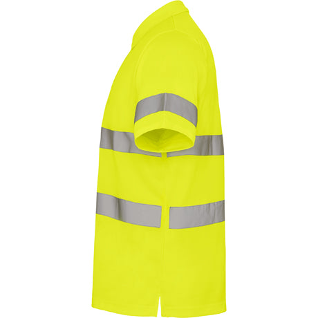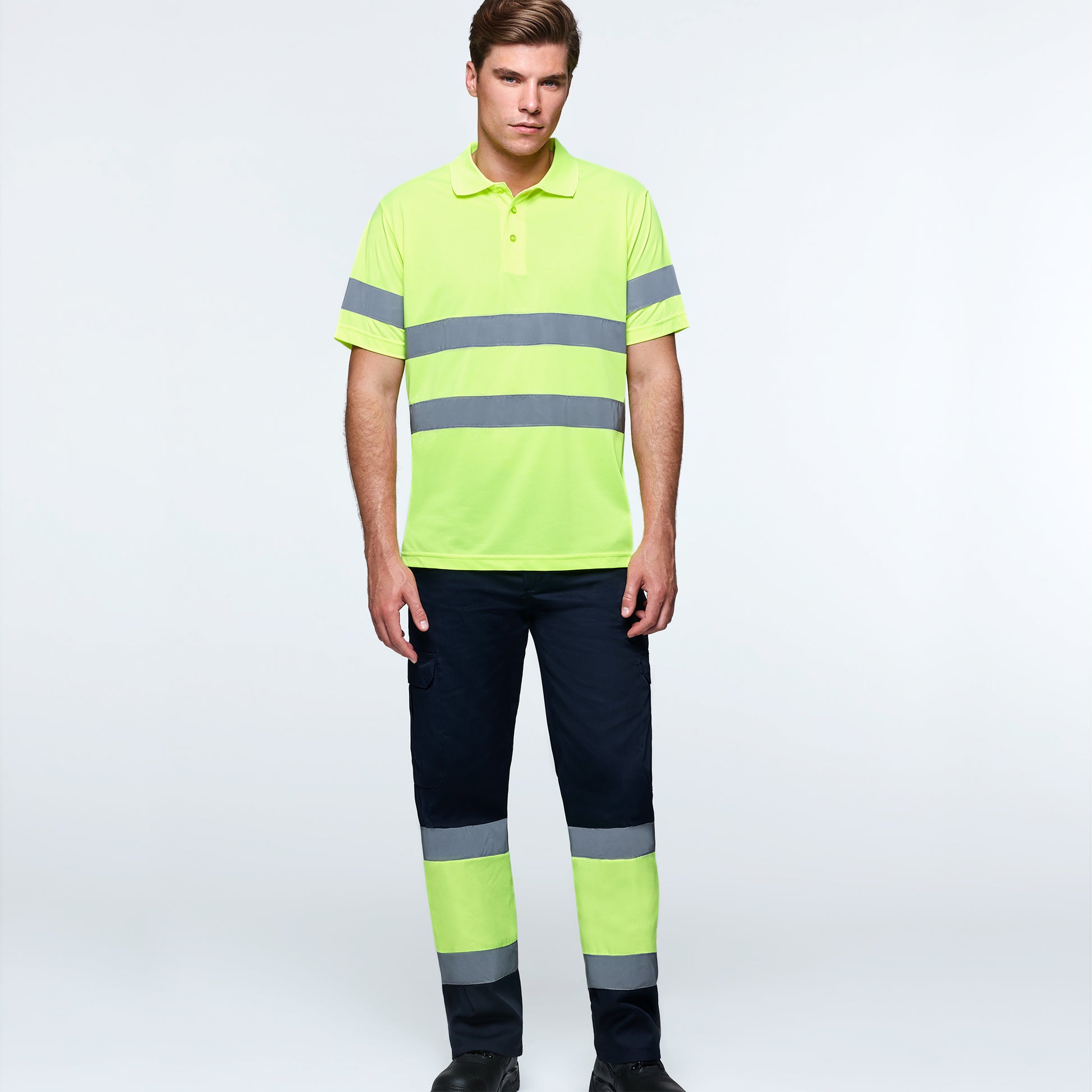 Polo técnico manga corta de alta visibilidad. Con tapeta a 3 botones. Cuello en punto canalé 1x1. Dos bandas reflectantes horizontales en torso y mangas. Tejido anti enganches.