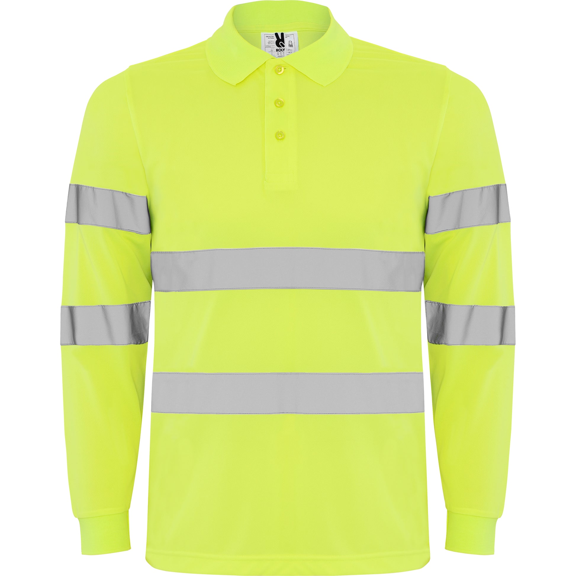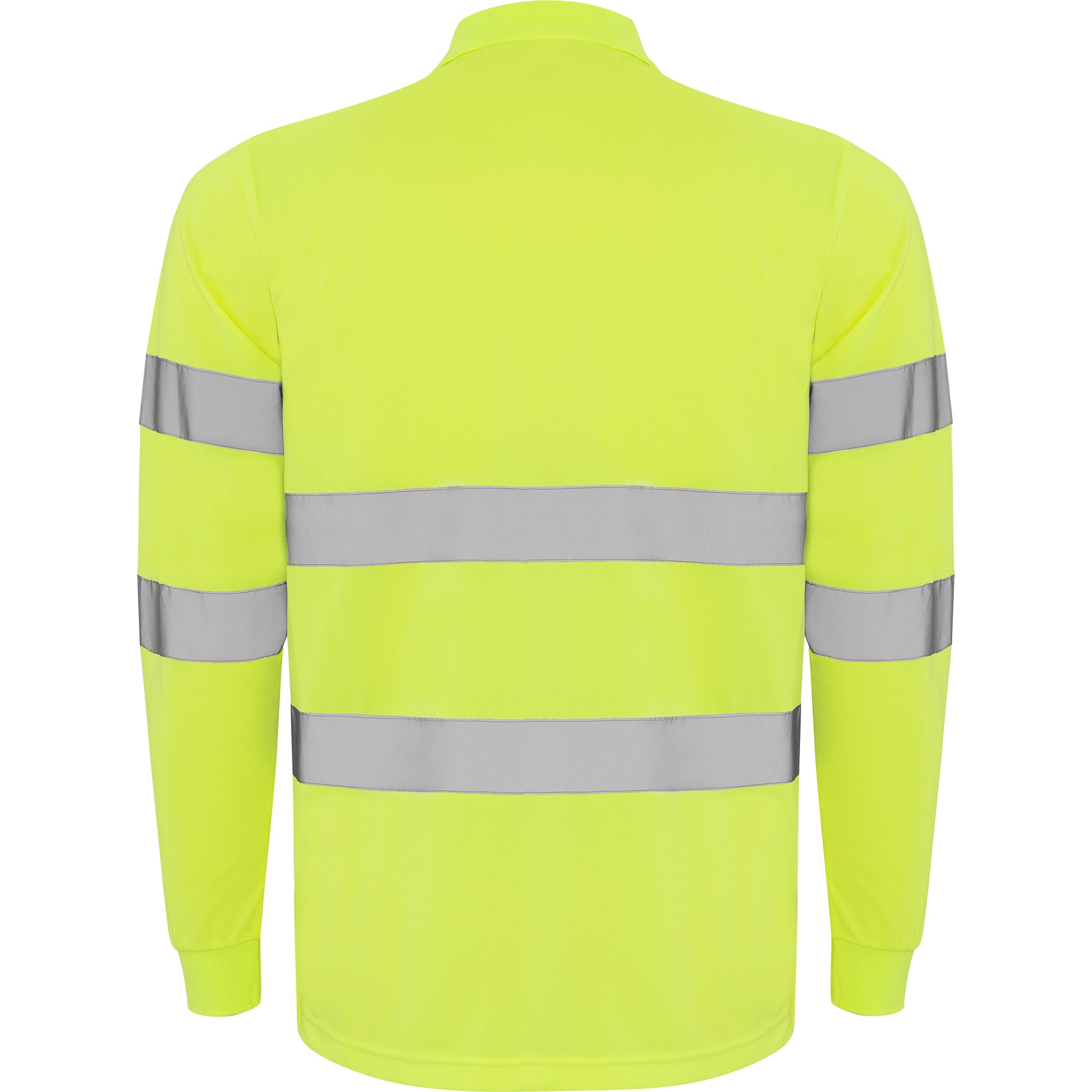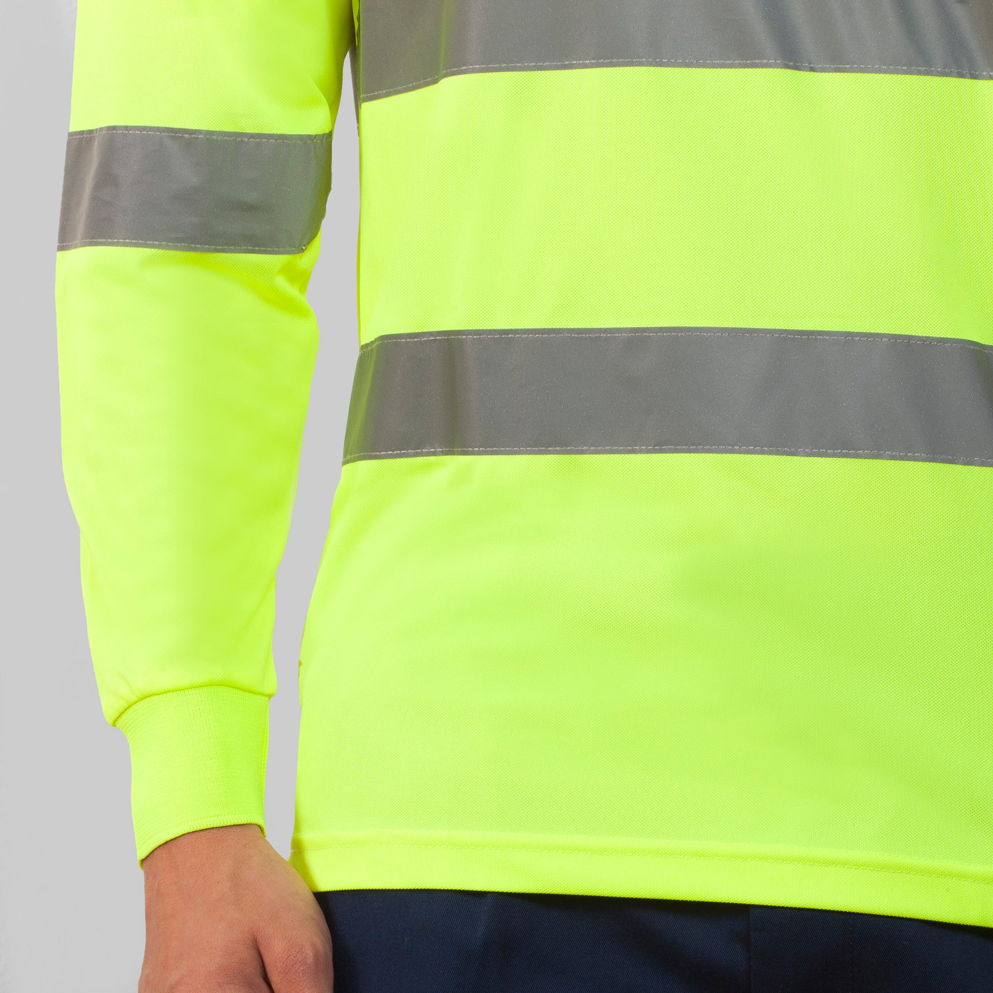 Polo técnico manga larga de alta visibilidad. Con tapeta a 3 botones. Cuello y puños en punto canalé 1x1. Dos bandas reflectantes horizontales en torso y mangas. Tejido anti enganches.