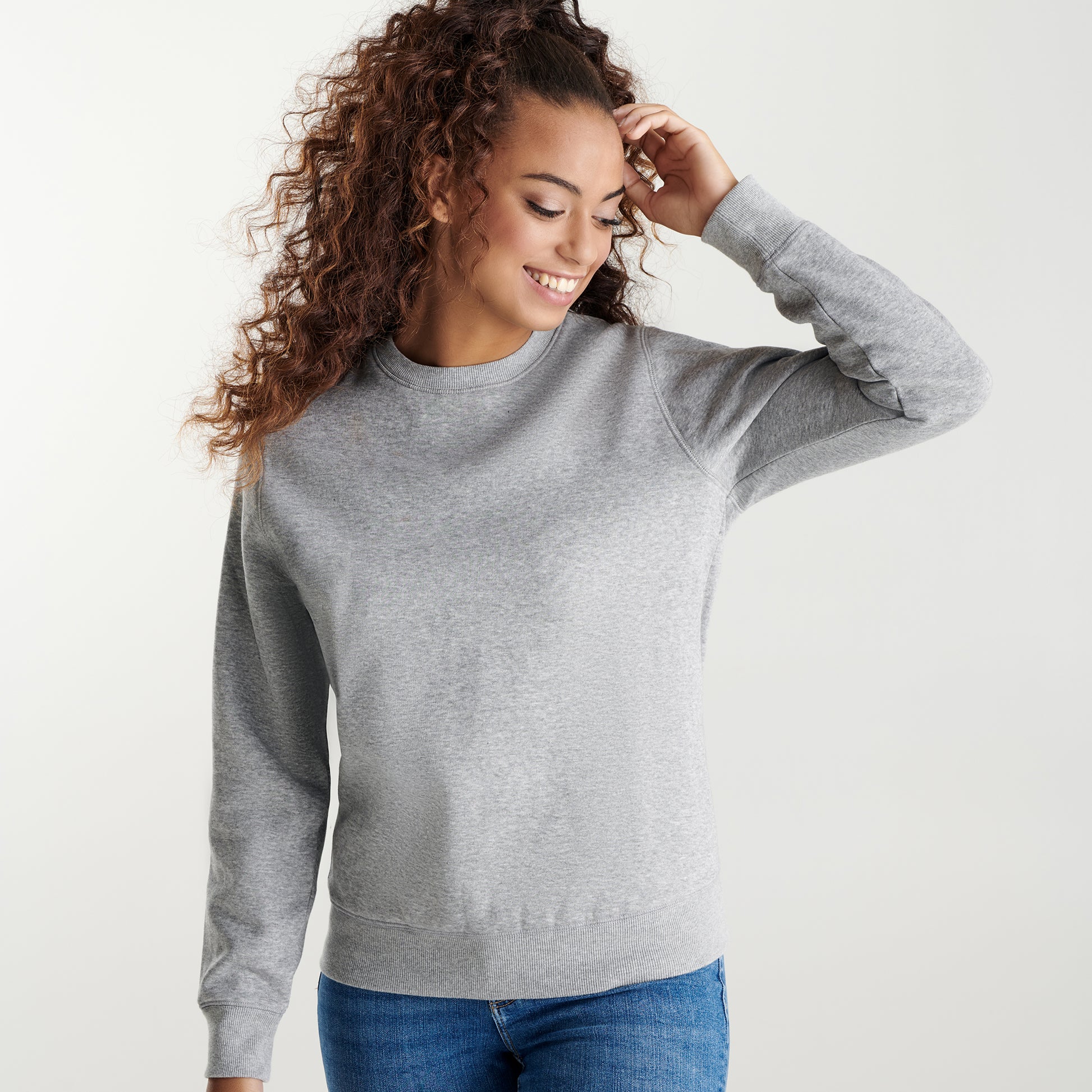 Sudadera Unisex en Algodón Orgánico Peinado y Poliéster Reciclado. Cuello, puños y cinturilla de punto canalé 2x1. Adorno de costuras remalladas en hombro, sisa, cuello, puños y cintura. Media luna en el interior del cuello trasero.